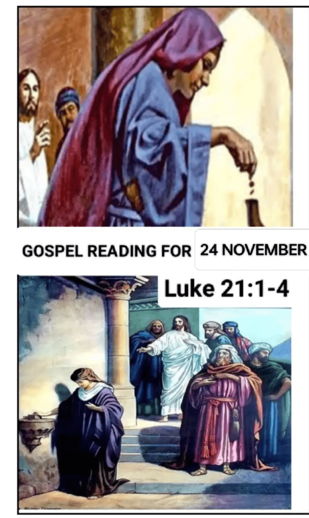 TODAY’S GOSPEL READING 24 NOVEMBER, 2025 Luke 21:1-4 When Jesus looked up he saw some wealthy people putting their offerings into the treasury and he noticed […]