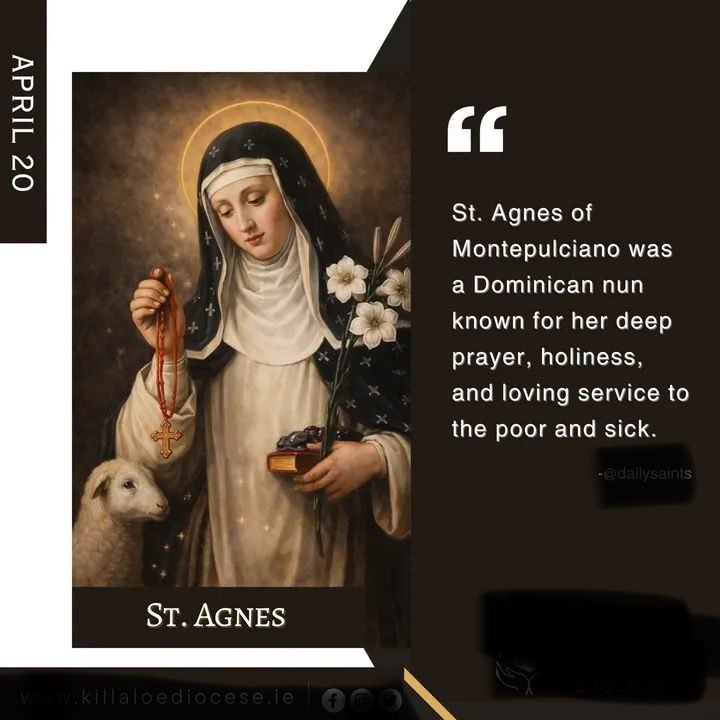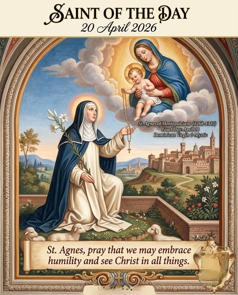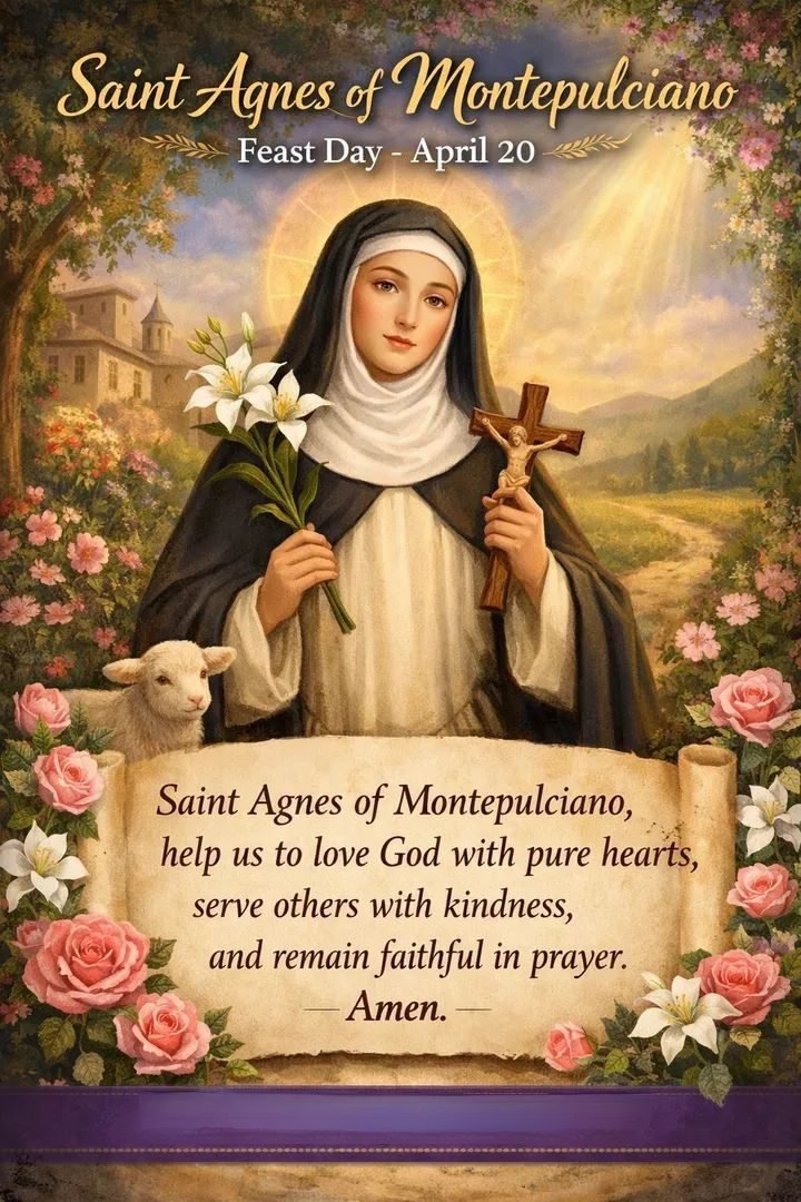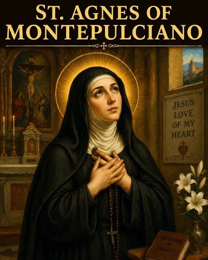 Saint Agnes of Montepulciano was a Dominican mystic known for deep prayer, spiritual gifts, and humble leadership as an abbess. Her life reveals a quiet union of contemplation, simplicity, and service. Born in Italy, she entered religious life at a young age and later led her community with wisdom and grace. She lived during a time when religious life and mystical spirituality flourished, especially within the growing Dominican tradition.