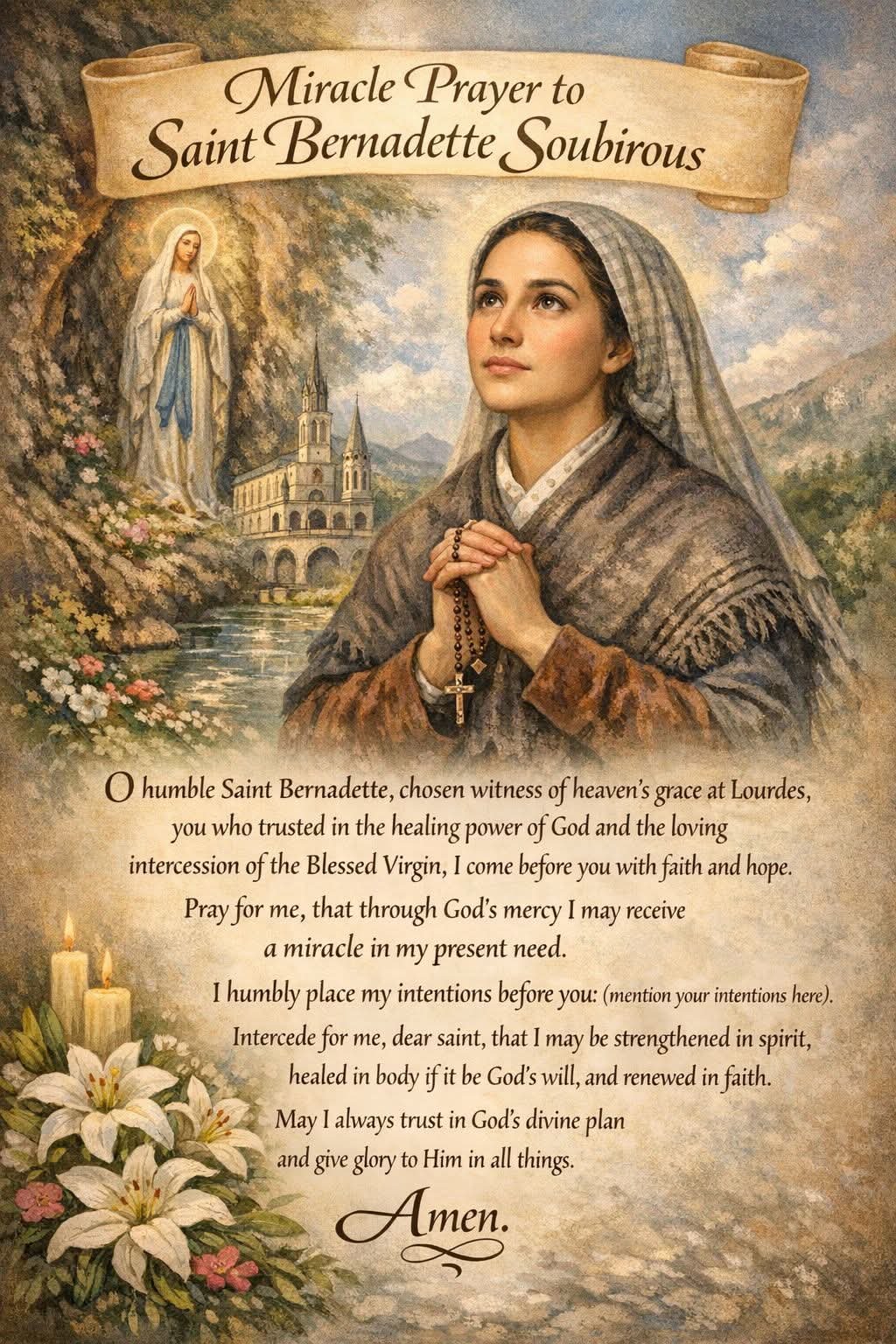Saint Bernadette is one of the most beloved modern saints, remembered for her simplicity, honesty, and steadfast faith in the midst of extraordinary experiences. Through her life, the world received the message of Our Lady of Lourdes, a call to prayer, penance, and deep trust in God.