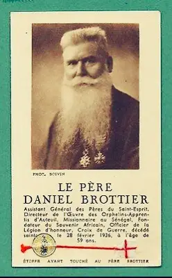 Restless in his life as a teacher and determined to be a missionary, the young Abbé Brottier decided to give his life to bringing the gospel to unbelievers. With this in mind he entered the congregation of the Holy Ghost Fathers. He was sent as a missionary to Senegal, W. Africa where he worked with great drive and commitment in the parish of St. Louis. After completing his novitiate, the now-Father Brottier was sent by the congregation to serve as a vicar in a mission parish in Saint-Louis, Senegal in 1903. He was disappointed that he had been assigned to a city rather than the more difficult interior.