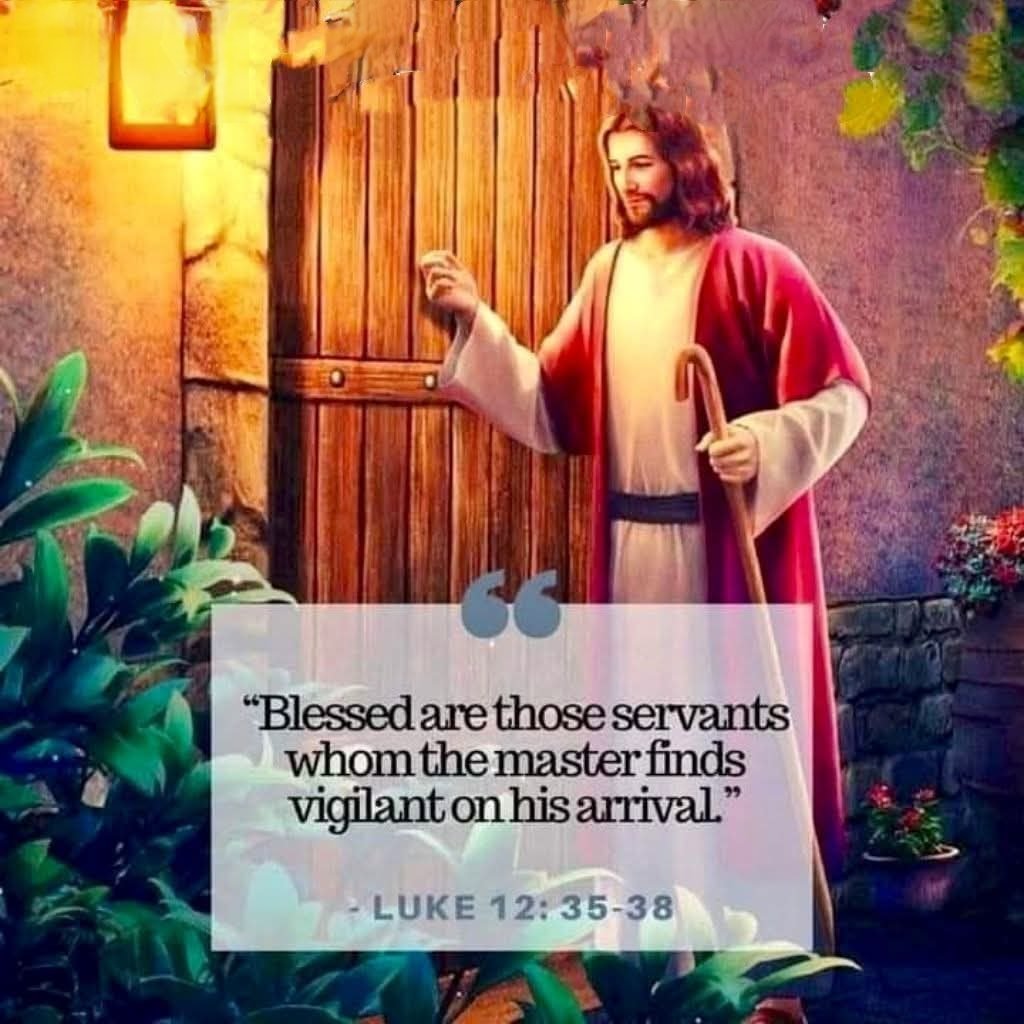 Gird your loins and light your lamps and be like servants who await their master’s return from a wedding, ready to open immediately when he comes and knocks. Blessed are those servants whom the master finds vigilant on his arrival.