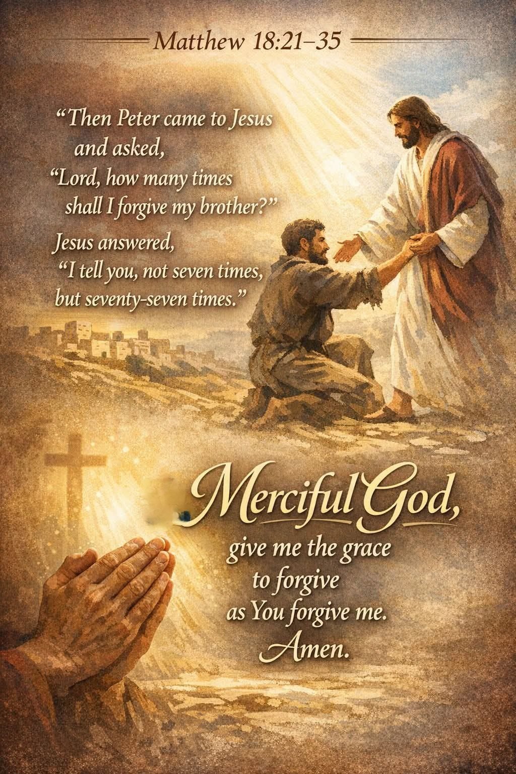 Jesus teaches that forgiveness is not meant to be limited or calculated. When Peter asks how many times he must forgive, Jesus answers with a number that symbolizes limitless mercy. Forgiveness in the Christian life is not a duty counted in numbers but a disposition of the heart.