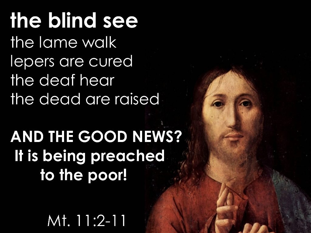 And Jesus answered them, “Go and tell John what you hear and see: the blind receive their sight and the lame walk, lepers are cleansed and the deaf hear, and the dead are raised up, and the poor have good news preached to them. And blessed is the one who is not offended by me.”