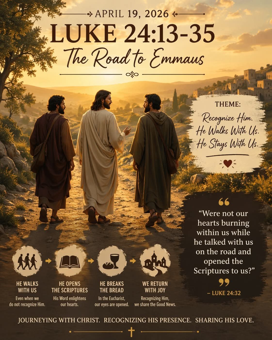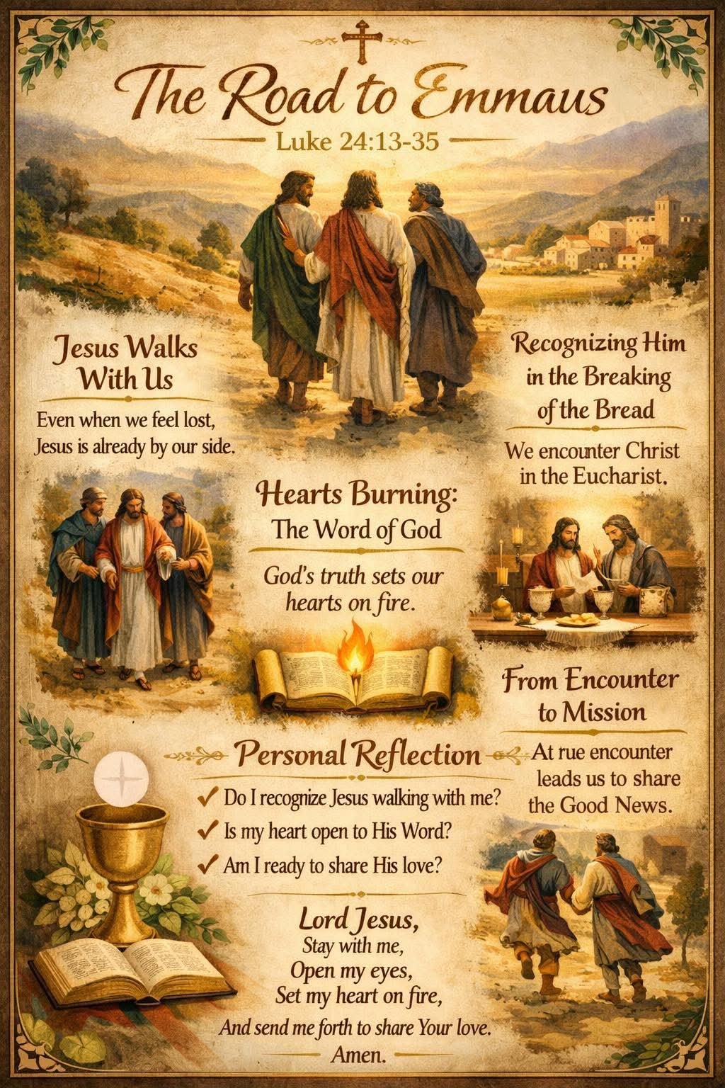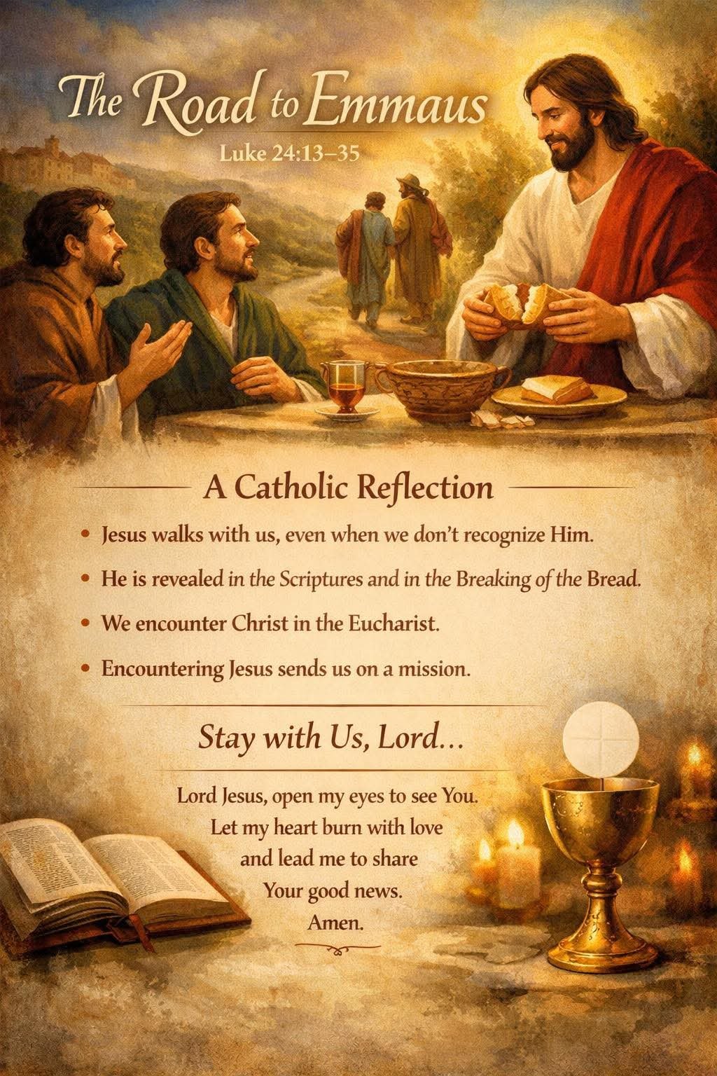 Lord Jesus, stay with me when I feel discouraged and unsure. Open my eyes to see You in my daily life and my heart to understand Your Word. Let my heart burn with love for You, and help me recognize You in the simple and sacred moments.