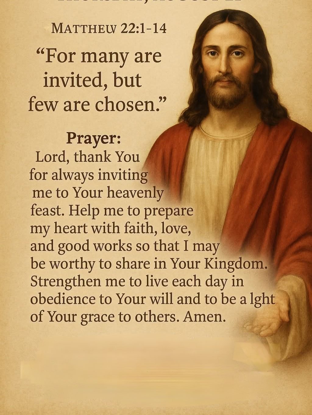 The Lord invites us daily to His heavenly banquet. Just like in today’s parable, God calls us not only to attend but to come prepared—with a heart clothed in faith, humility, and love. His invitation is open to all, yet it is our readiness and obedience that make us worthy to sit at His table.