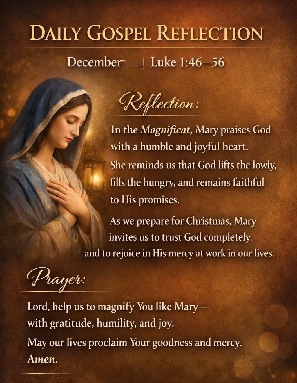 In the Magnificat, Mary praises God with a humble and joyful heart. She reminds us that God lifts the lowly, fills the hungry, and remains faithful to His promises. As we prepare for Christmas, Mary invites us to trust God completely and to rejoice in His mercy at work in our lives.