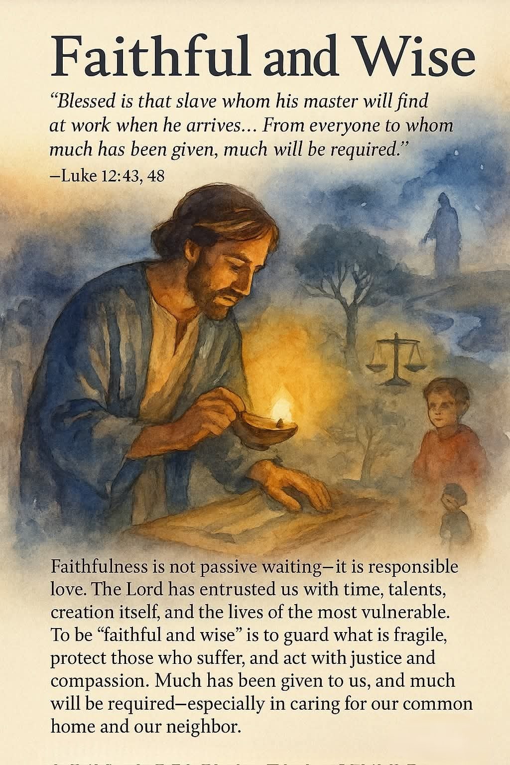Lord Jesus, help me to live each moment with the awareness that You may come at any time. Teach me to be a faithful steward of all You have entrusted to me—my time, talents, and relationships. Guard my heart against laziness and distraction, and fill me with zeal to serve You faithfully. When You come, may You find me watchful, obedient, and ready to receive You with joy. Amen