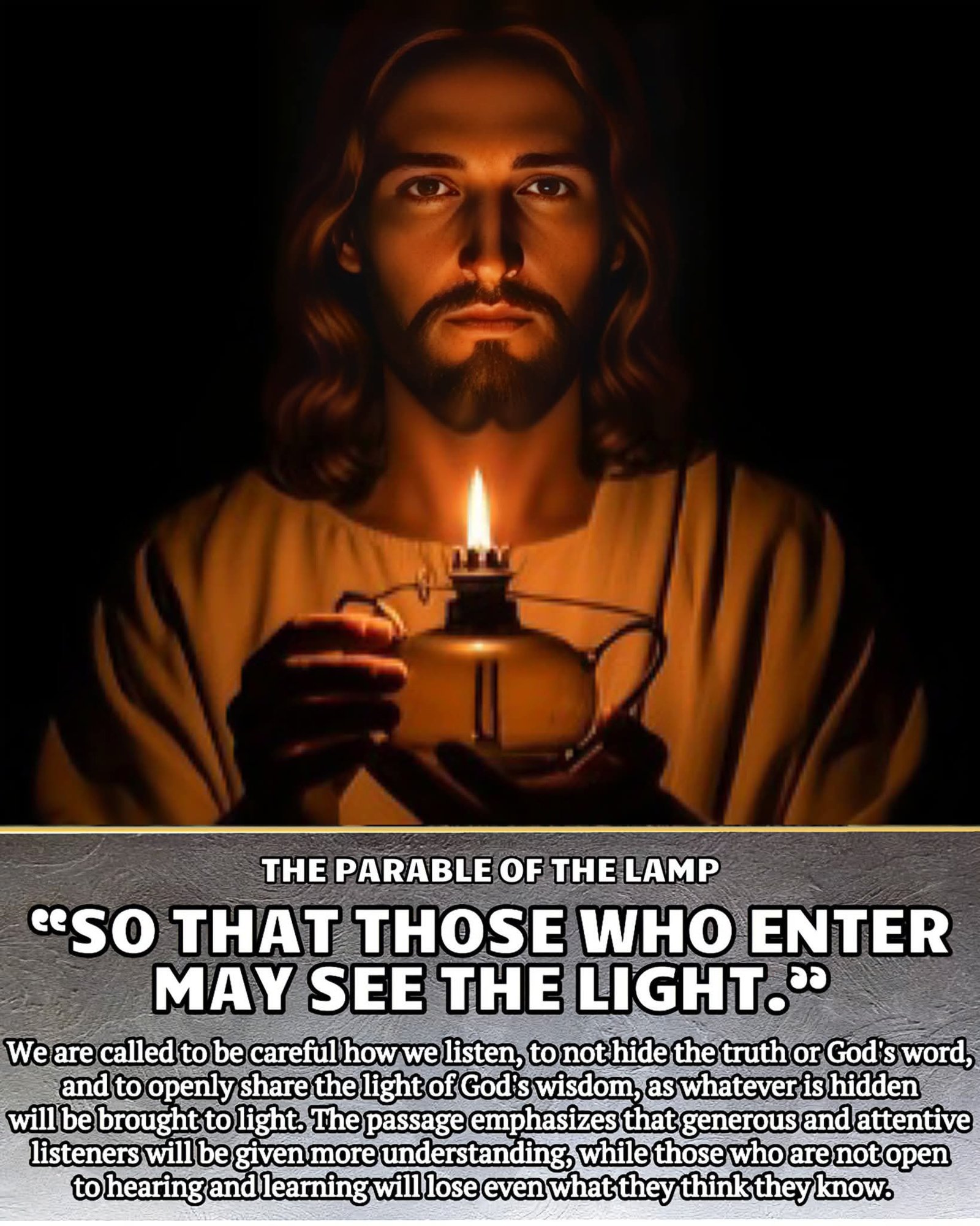 Jesus reminds us that the light we receive from Him is not meant to be hidden but shared. A lamp is placed on a stand so that its radiance reaches everyone. In the same way, our faith, love, and understanding of God’s Word are not for private keeping but for shining forth in our words and actions. The passage also cautions us to listen attentively, for those who value and live by God’s truth will grow in abundance, while neglect leads to loss. It calls us to be faithful stewards of the grace we have received, letting it bear fruit for the good of others and the glory of God.