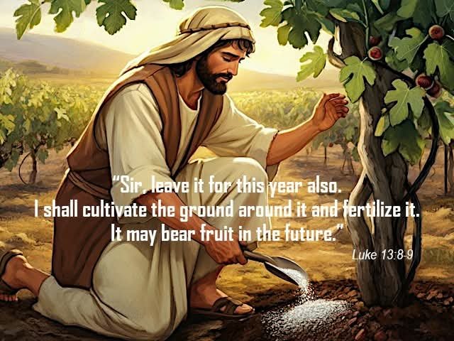 He said to him in reply, “Sir, leave it for this year also, and I shall cultivate the ground around it and fertilize it; it may bear fruit in the future. If not you can cut it down”.