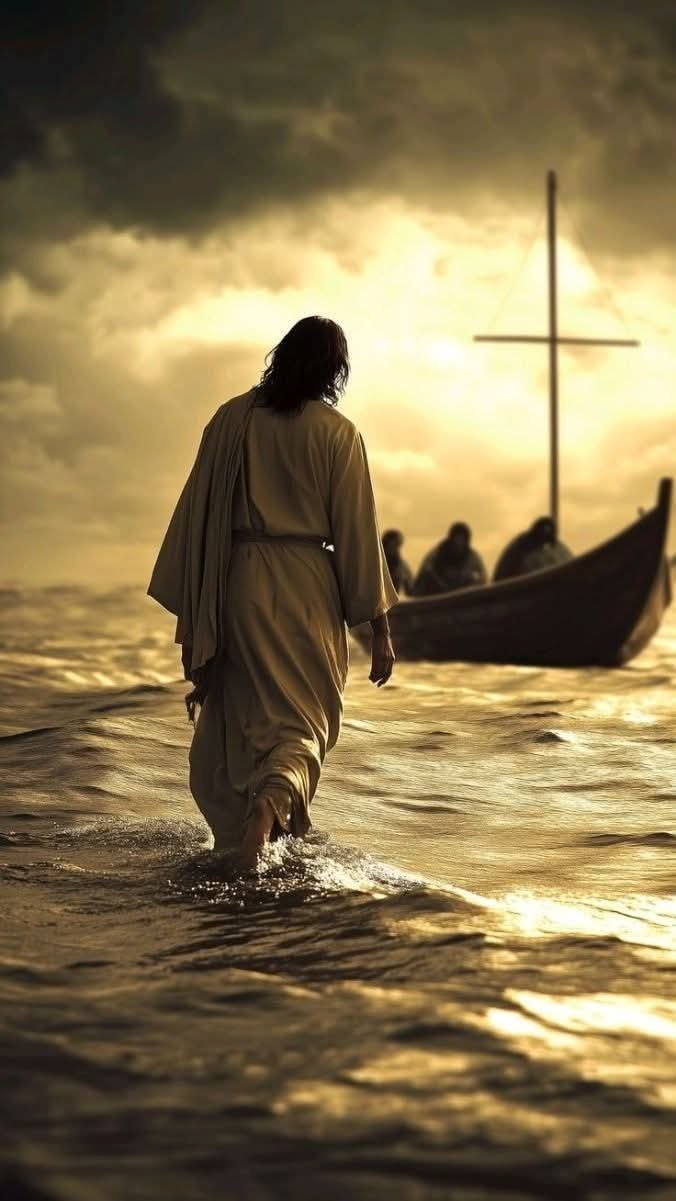 In this passage, the disciples find themselves struggling against strong winds, exhausted and afraid, while Jesus seems distant, praying on the mountain. Yet He sees them in their distress and comes to them, walking on the sea. Their fear blinds them to His presence; instead of recognizing His saving nearness, they are terrified. This reveals how easily human hearts can forget God’s power, even after witnessing miracles like the feeding of the five thousand.